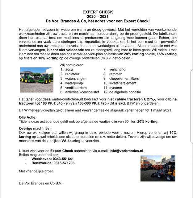 Het afgelopen seizoen is wederom warm en droog geweest. Met het verrichten van voorkomende werkzaamheden zijn uw tractoren en machines hierdoor danig op de proef gesteld. De fabrikanten doen hun uiterste best om machines te produceren die langdurig mee kunnen gaan. Echter, om vervelende en vaak dure storingen c.q. reparaties te voorkomen, is het een must om preventief onderhoud aan uw tractoren, shovels, kranen en werktuigen uit te voeren. Alleen motorolie met wat filters vervangen, is echt niet voldoende om ze storingsvrij lang mee te laten gaan. Wij raden u met klem aan om mee te doen aan ons winter-service-plan op basis van 20% korting op olie, 15% korting op filters en 10% korting op de overige onderdelen (m.u.v. netto-delen).