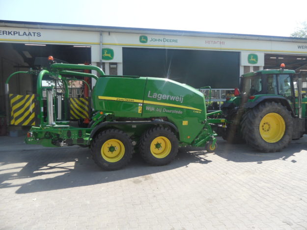 Deze John Deere pers is naar wens van de klant uitgevoerd op speciale brede wielen.
