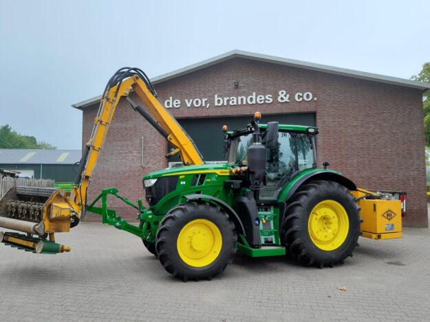 De Bos maaiarm combinatie hebben wij opgebouwd op deze John Deere en daarvoor hebben wij de uitlaat van rechts naar links moeten brengen.